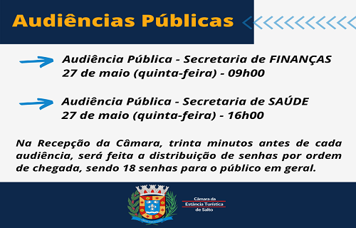 Audiências Públicas das secretarias de Finanças e de Saúde acontecem na próxima semana