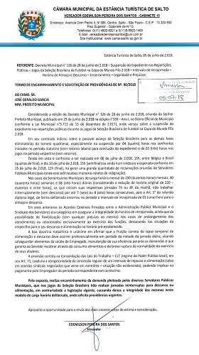 Edemilson questiona prefeito sobre decreto que prejudica horário de almoço e descanso de servidores em dias de jogos do Brasil na Copa