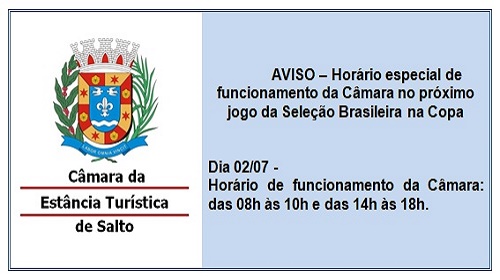 AVISO – Horário especial de funcionamento da Câmara nos próximos jogos da Seleção Brasileira na Copa