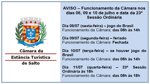AVISO – Funcionamento da Câmara nos dias 06, 09 e 10 de julho e data da 23ª Sessão Ordinária