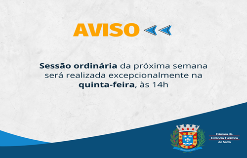 Sessão ordinária da próxima semana será realizada na quinta-feira, às 14h
