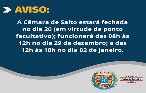 COMUNICADO: Câmara estará fechada no dia 26 e funciona em meio período nos dias 29 de dezembro e 02 de janeiro