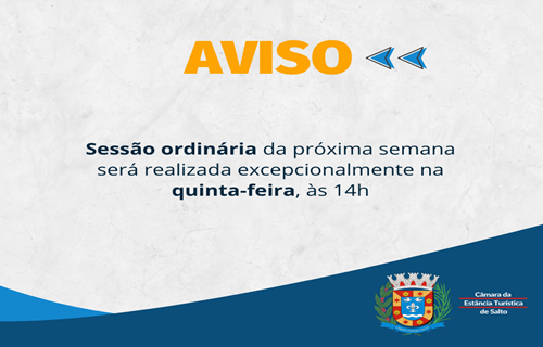 Sessão ordinária da próxima semana será realizada na quinta-feira, às 14h