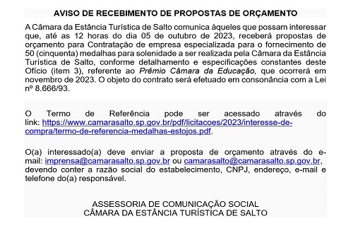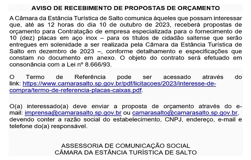 AVISO DE RECEBIMENTO DE PROPOSTAS DE ORÇAMENTO